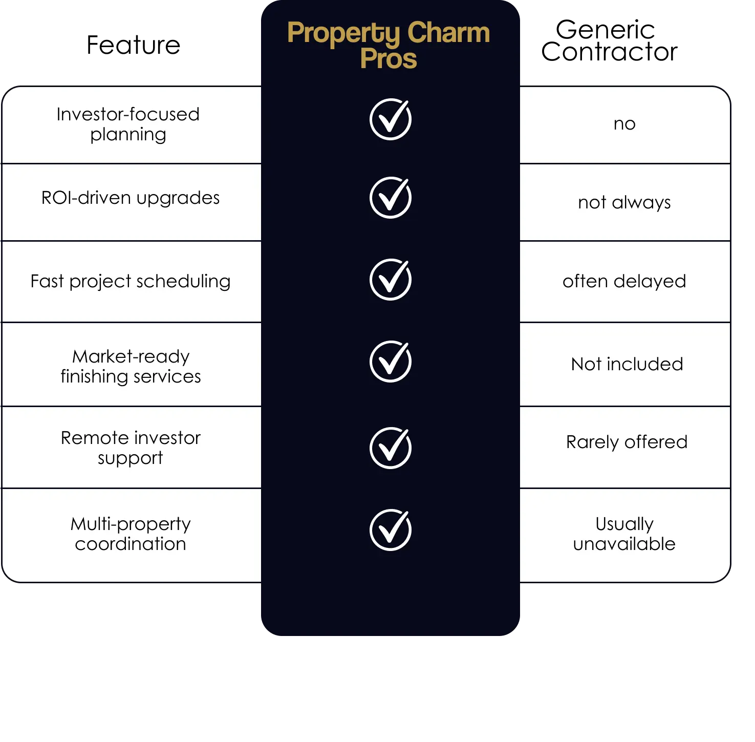 When it comes to preparing investment properties for sale or rental, not all renovation partners are created equal. At Property Charm Pros, we specialize in serving real estate investors, vacation rental owners, and industry professionals with renovation solutions that are fast, reliable, and focused on maximizing your return on investment. Here’s what sets us apart: